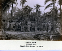 During the recording you’ll hear my dad mention that he was involved in reconnaissance on various islands. Here’s a photo (click to enlarge) he treasured from that work. My dad is standing in front of this group photo – – you can see him with his officer’s hat on (his white t-shirt is showing).