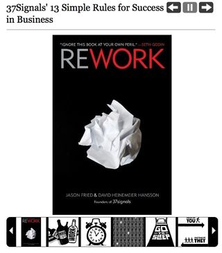 Stripped of all big words and fancy strategies, Rework’s collection of short, inspiring essays advocates a “less is more” approach to starting your own business, handing out tips on increasing productivity and debunking myths in business.